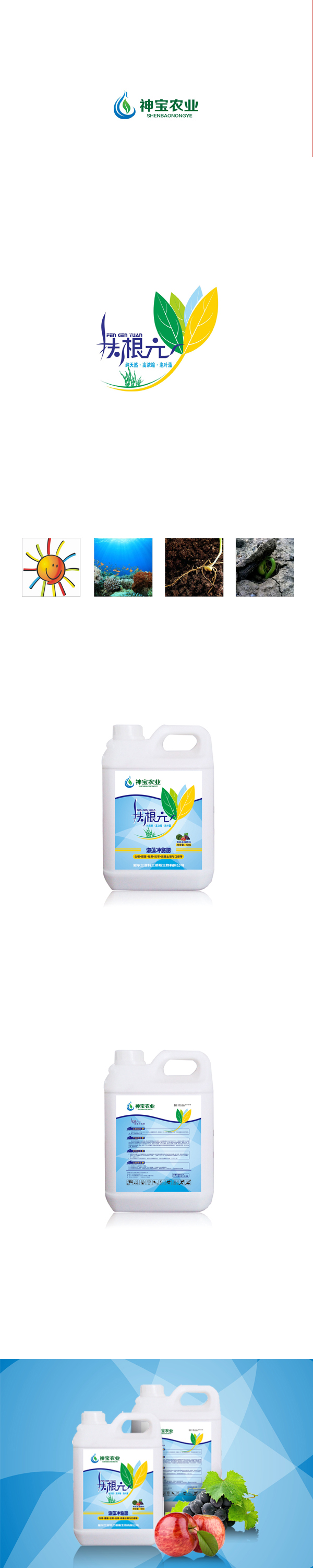 2、蓝色波浪线条表示海面,下部分是阳光透过海面的一个"意向"视图,来表示产品的水溶肥料性质.